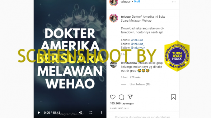 Akun @teluuur mengunggah video konferensi pers dokter amerika mengenai COVID-19, dengan narasi “Dokter² Amerika Ini Buka Suara Melawan Wehao. Download sekarang sebelum di-takedown, nontonnya nanti aja!”