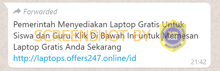 Beredar pesan berantai yang menyatakan bahwa pemerintah menyediakan laptop gratis untuk siswa dan guru disertai tautan. Ketika tautan itu dibuka melalui ponsel akan mengarah kepada laman yang meminta data nomor telepon.
