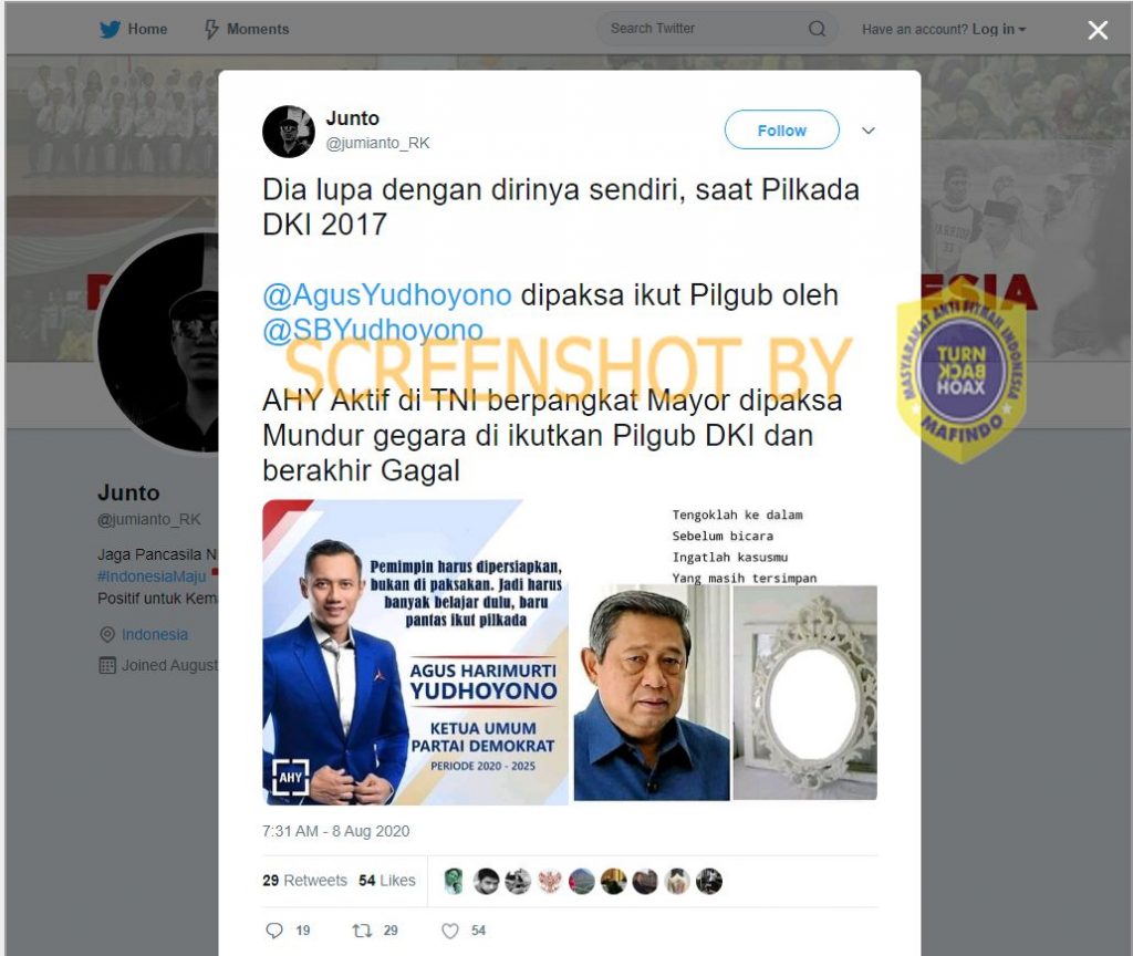 Akun twitter @jumianto_RK mengunggah gambar pada tanggal 8/8/2020 berupa poster Agus Harimurti Yudhoyono (AHY) sebagai Ketua Umum Partai Demokrat Periode 2020-2025 dengan narasi sebagai berikut: