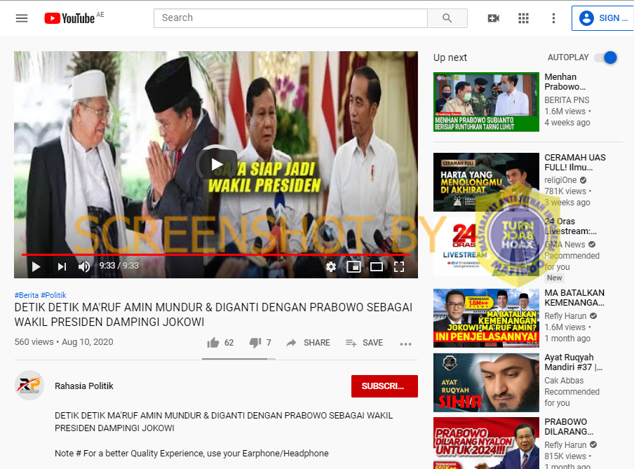 Kanal Youtube Rahasia Politik mengunggah video dengan judul “DETIK DETIK MA'RUF AMIN MUNDUR & DIGANTI DENGAN PRABOWO SEBAGAI WAKIL PRESIDEN DAMPINGI JOKOWI” yang berdurasi 9:31 menit.