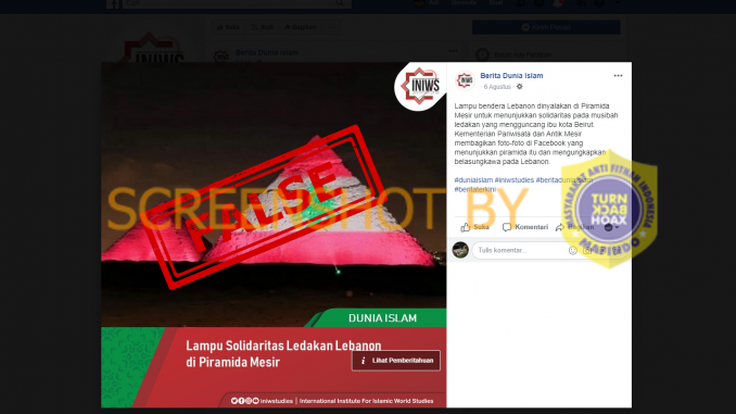 Berdasarkan hasil penelusuran Tim Periksa Fakta AFP, klaim adanya foto piramida di Giza, Mesir, yang dihiasi cahaya lampu bergambar bendera Lebanon dan diklaim hal itu sebagai bentuk solidaritas terhadap korban ledakan di Beirut adalah klaim yang salah.