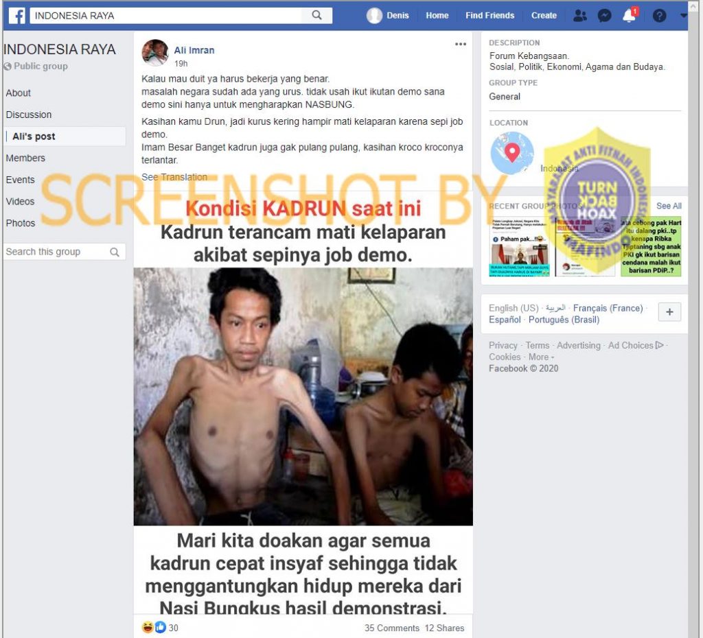 Akun Facebook Ali Imron membagikan gambar di grup Indonesia Raya pada 10/8/2020 yang memperlihatkan dua orang laki-laki yang mengalami gizi buruk dengan narasi sebagai berikut: