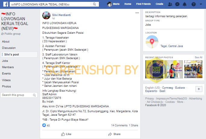 Akun facebook bernama Silvi Herdianti mengunggah status pada tanggal 11/8/2020 di grup facebook ‘🇮🇩INFO LOWONGAN KERJA TEGAL (NEW)🇮🇩’ mengenai info lowongan pekerjaan di Puskesmas Marganada.