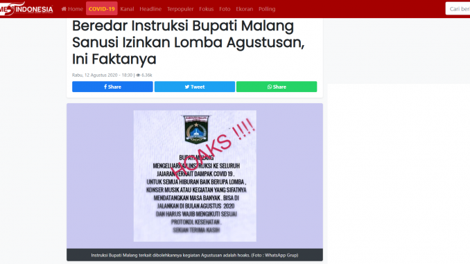 Beredar tangkapan layar terkait instruksi Bupati Malang Sanusi yang mengizinkan pengadaan lomba Agustusan, konser musik dan kegiatan lain yang mengundang keramaian di tengah pandemi. Agar lebih meyakinkan masyarakat, pada gambar instruksi turut disematkan logo Pemerintahan Kabupaten Malang.