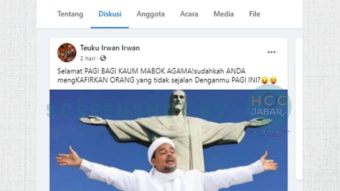Akun Facebook Teuku Irwan Irwan atau @teukuirwan.irwan.1 mengunggah foto tokoh Front Pembela Islam (FPI), Habib Rizieq Shihab (HRS) dan patung Christ the Redeemer di Rio de Janeiro, Brasil pada Rabu (12/8). Dalam unggahan tersebut terdapat narasi: