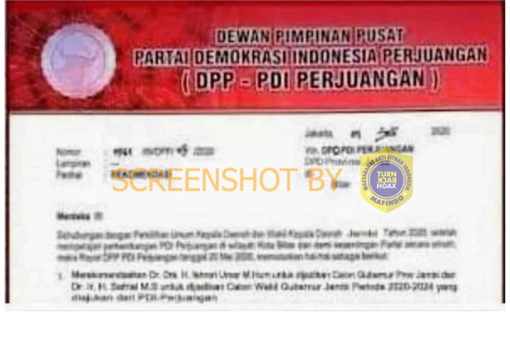 Beredar sebuah foto surat rekomendasi PDIP untuk pasangan Fachrori-Safrial pada pemilihan Gubernur dan Wakil Gubernur Jambi. Dalam foto tersebut, terlihat kop surat dengan lambang PDIP yang berwarna merah muda dengan warna lebih tua pada gambar banteng. Dalam foto itu tertera tulisan “Rekomendasi diberikan kepada Dr. Drs. H. Fachrori Umar, MHum sebagai Calon Gubernur Jambi dan Dr. Ir. H. Safrial, M.Si sebagai Calon Wakil Gubernur Jambi periode 2020-2024 yang diusung PDI Perjuangan.”