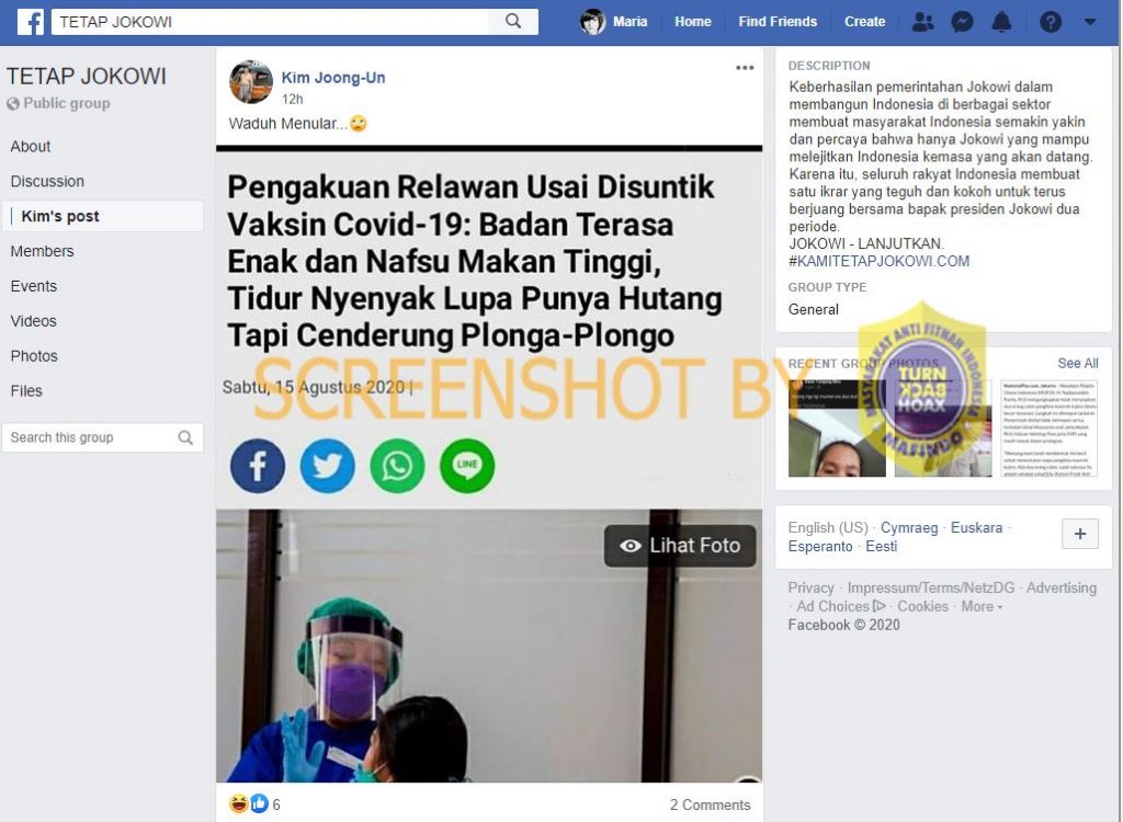 Akun Facebook Kim Joong-Un mengunggah gambar pada tanggal 16/8/2020 berupa tangkapan layar artikel berita dengan judul “Pengakuan Relawan Usai Suntik Vaksin Covid-19: Badan Terasa Enak dan Nafsu Makan TInggo, Tidur Nyenyak Lupa Punya Hutang Tapi Cenderung Plonga-Plongo” yang tayang pada 15 Agustus 2020.