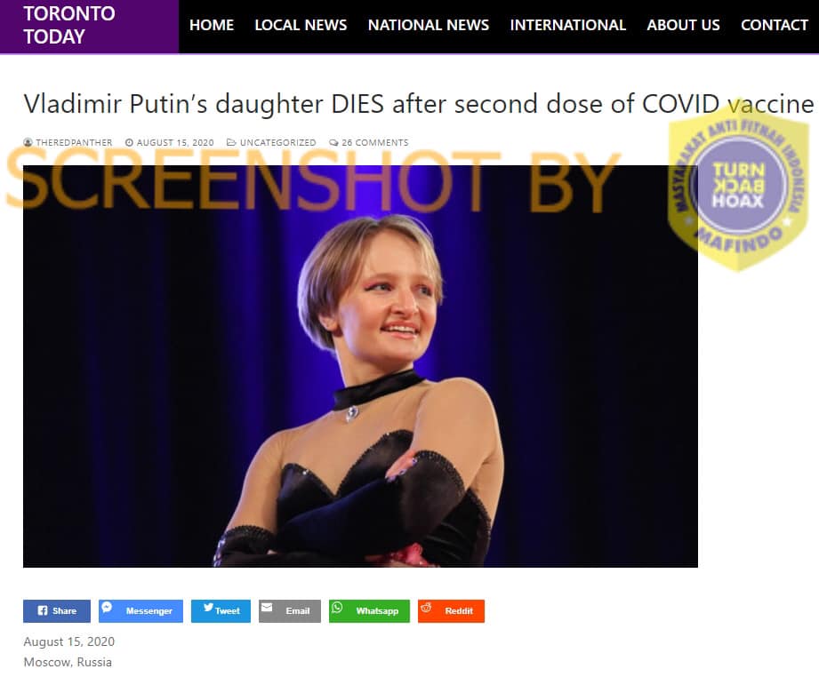 Portal berita Toronto Today menuliskan berita yang berjudul “Vladimir Putin’s daughter DIES after second dose of COVID vaccine” pada 15 Agustus 2020. Dalam berita tersebut, disebutkan bahwa putri Presiden Vladimir Putin menderita efek samping yang tak terduga pada vaksin COVID eksperimental Rusia dan meninggal di Moskow. Sebuah sumber yang tidak diketahui yang dikutip dalam berita itu menyebutkan putri Presiden Putin, Katerina Tikhonova, mengalami kenaikan suhu tubuh tak lama setelah suntikan kedua, kemudian mengalami kejang, dan dinyatakan meninggal pada Jumat malam kemarin.