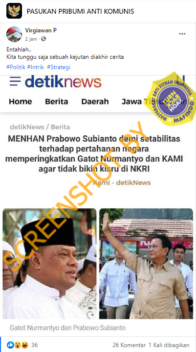 Akun Facebook Virgiawan P mengunggah tangkapan layar portal detiknews.com di grup Pasukan Pribumi Anti Komunis. Artikel pada tangkapan layar tersebut berjudul “MENHAN Prabowo Subianto demi stabilitas terhadap pertahanan negara memperingkatkan Gatot Nurmantyo dan KAMI agar tidak bikin kisru di NKRI.”