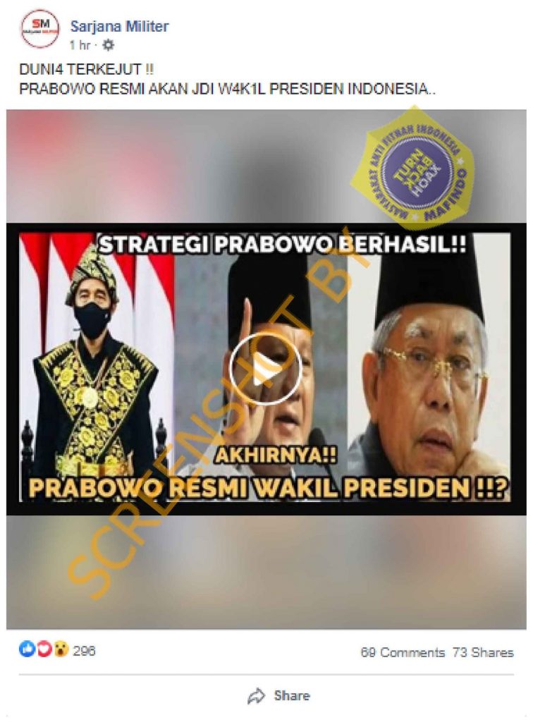 Sebuah akun Facebook Sarjana Militer mengunggah video yang berjudul “DUNIA TERKEJUT !! PRABOWO AKAN R3SMI JADI W4KIL PRESIDEN INDONESIA!!?” video tersebut berisi potongan-potongan pernyataan dan pidato dari tokoh-tokoh negara seperti Jokowi, Prabowo, Susilo Bambang Yudhoyono, juga Anies Baswedan.