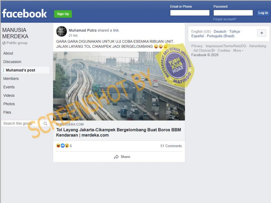 Akun Facebook Muhamad Putra membagikan tautan artikel (19/082020) dari Merdeka.com yang berjudul “Tol Layang Jakarta-Cikampek Bergelombang Buat Boros BBM Kendaraan” dengan narasi sebagai berikut: