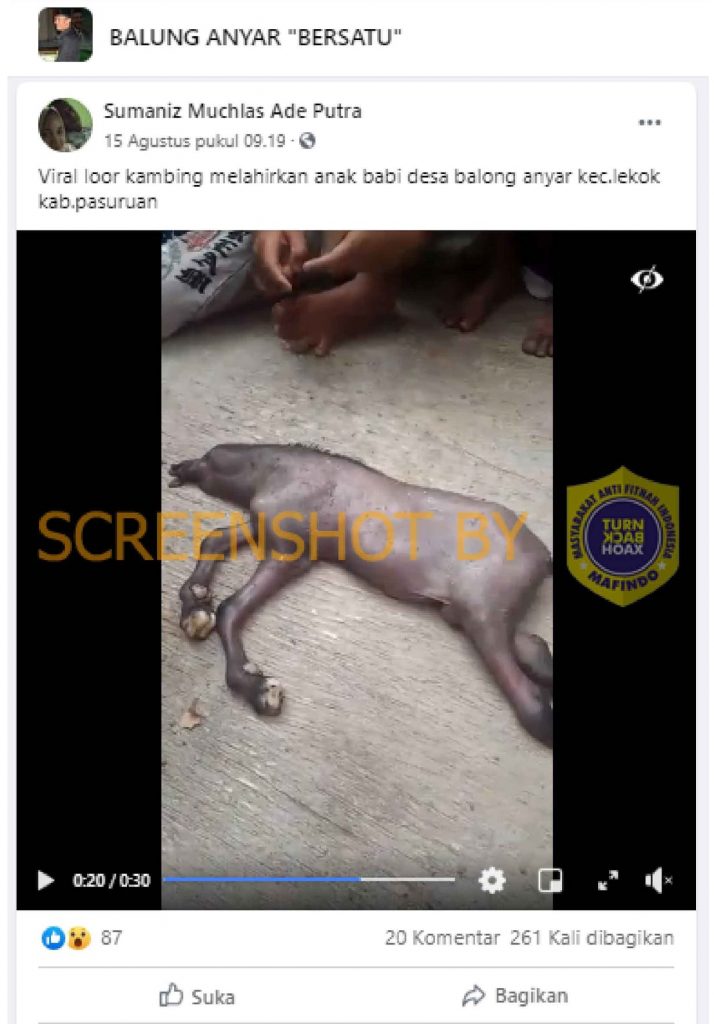 Sebuah akun Facebook bernama Sumaniz Muchlas Ade Putra mengunggah video berdurasi 30 detik yang memperlihatkan seekor anak kambing yang dikerubungi warga. Video yang telah dibagikan sebanyak 265 kali itu diklaim sebagai kambing yang melahirkan anak kambing.