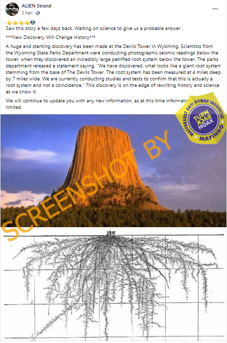 Akun Facebook ALIEN Strand membagikan dua gambar dengan narasi yang menyebutkan Devils Tower yang ada di Wyoming, Amerika Serikat merupakan sebuah pohon purba. Postingan itu sudah dibagikan sebanyak 74 kali dan mendapat respon 146 buah.