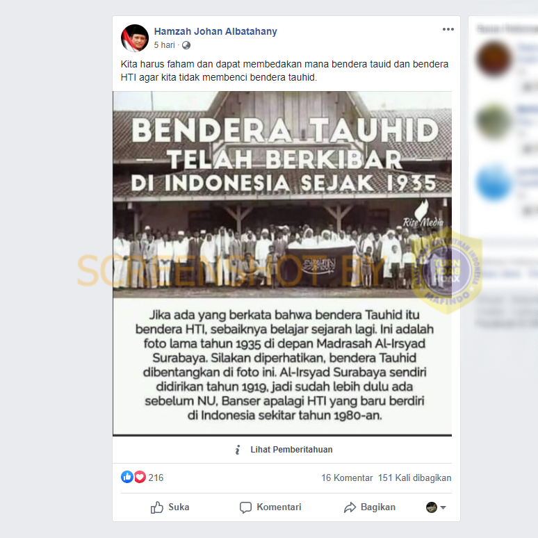“Jika ada yang berkata bahwa bendera Tauhid itu bendera HTI, sebaiknya belajar sejarah lagi. Ini adalah foto lama tahun 1935 di depan Madrasah Al-Irsyad Surabaya. Silakan diperhatikan, bendera Tauhid dibentangkan di foto ini. Al-Irsyad Surabaya sendiri didirikan tahun 1919, jadi sudah lebih dulu ada sebelum NU, Banser apalagi HTI yang baru berdiri di Indonesia sekitar tahun 1980-an.”