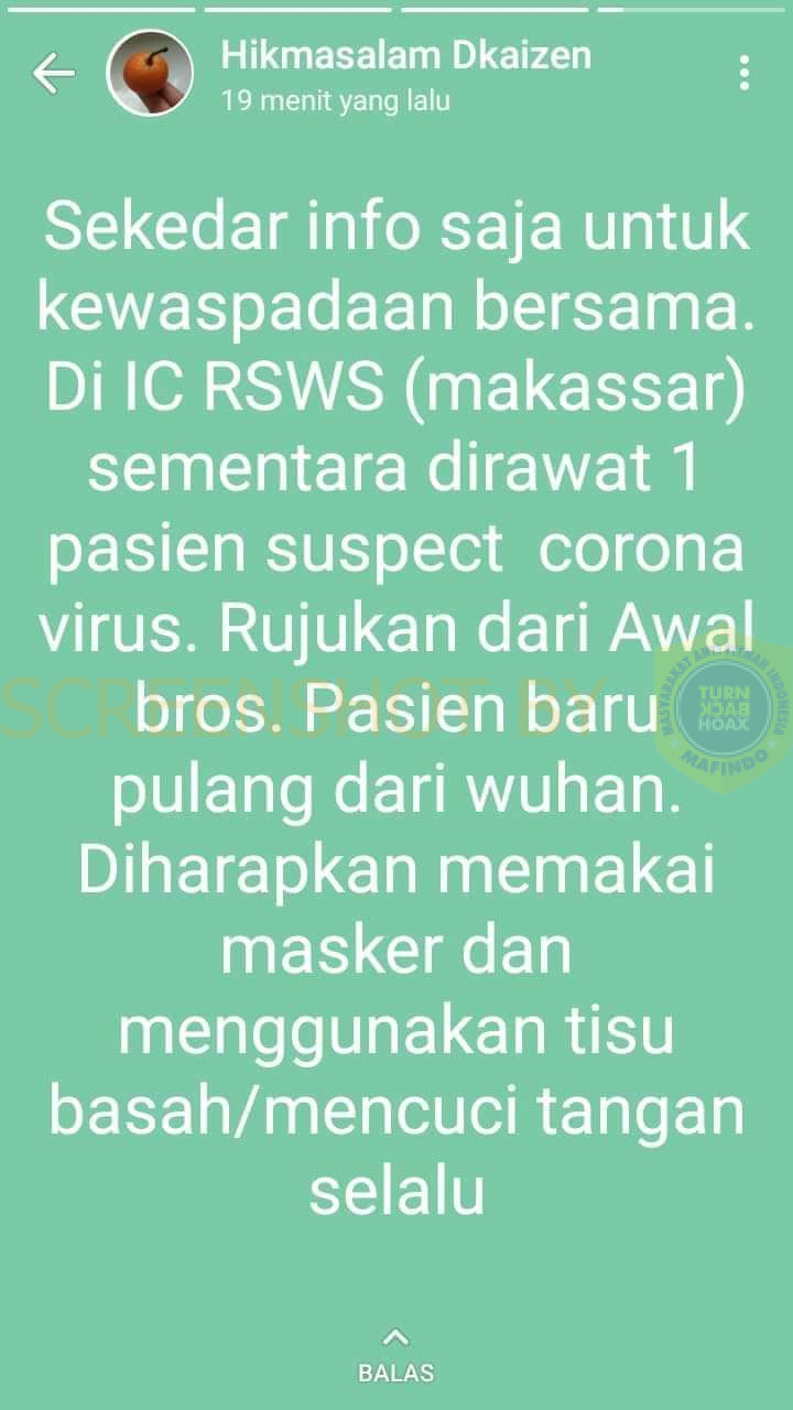 “Sekedar info saja untuk kewaspadaan bersama. Di IC RSWS (makassar) sementara dirawat 1 pasien suspect corona virus. Rujukan dari Awal bros. Pasien baru pulang dari wuhan. Diharapkan memakai masker dan menggunakan tisu basah/mencuci tangan selalu”.