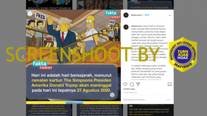 “Hari ini adalah hari bersejarah, menurut ramalan kartun The Simpsons Presiden Amerika Donald Trump akan meninggal pada hari ini tepatnya 27 Agustus 2020.”