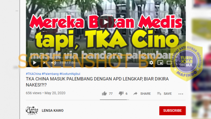Beredar video yang diunggah di kanal Youtube Lensa Kawo dengan judul “TKA CHINA MASUK PALEMBANG DENGAN APD LENGKAP, BIAR DIKIRA NAKES!?!?”