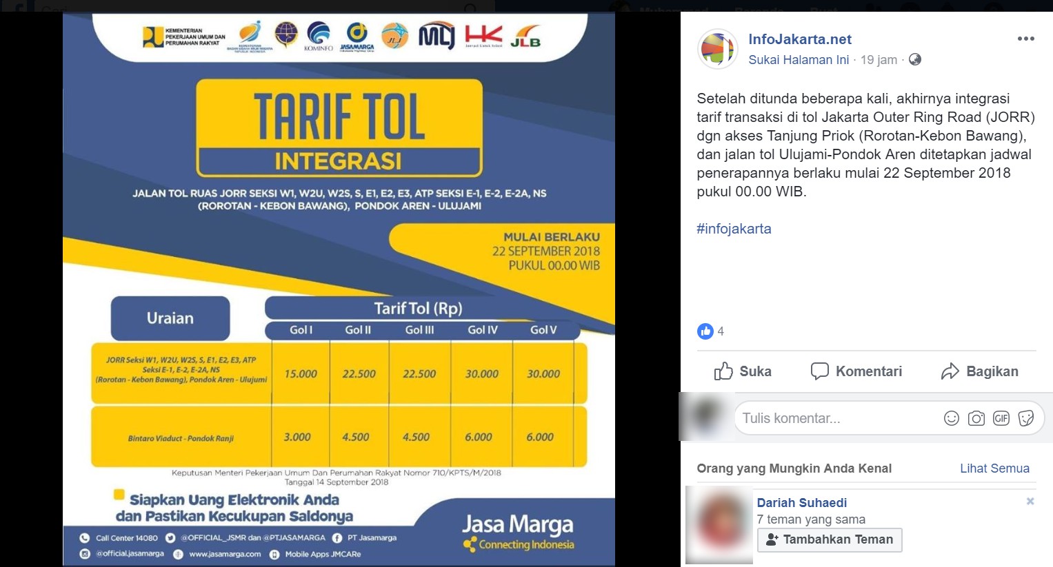 Infografis menggunakan nama Jasa Marga mengenai integrasi tarif tol Jakarta Outer Ring Road (JORR) yang akan dilaksanakan pada tanggal 22 September 2018 merupakan informasi yang tidak benar. Dilansir dari antaranews.com, kompas.com, kontan.co.id, beritasatu.com, cnnindonesia.com, dan viva.co.id, AVP Corporate Communication PT Jasa Marga Dwimawan Heru menegaskan bahwa informasi yang ada dalam infografis tersebut tidak resmi alias tidak benar. Sebab, menurutnya, saat ini Jasa Marga bersama Badan Usaha Jalan Tol (BUJT) pengelola ruas JORR lainnya masih melakukan koordinasi dengan Kementerian Pekerjaan Umum dan Perumahan Rakyat (PUPR). “Dapat kami informasikan bahwa pemberlakuan integrasi JORR paling lambat akhir September 2018,” jelas Dwimawan.