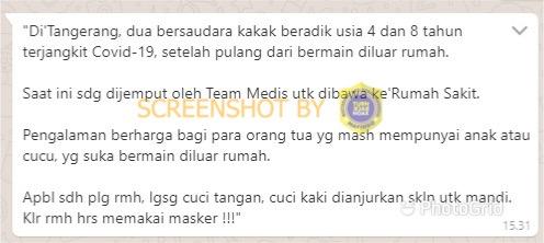 Beredar pesan berantai melalui Whatsapp dan video di Facebook menyebutkan, akibat main di luar rumah kakak beradik di Tangerang berusia 8 dan 4 tahun telah dijemput oleh Tim Medis untuk dibawa ke Rumah Sakit karena terjangkit Covid-19.