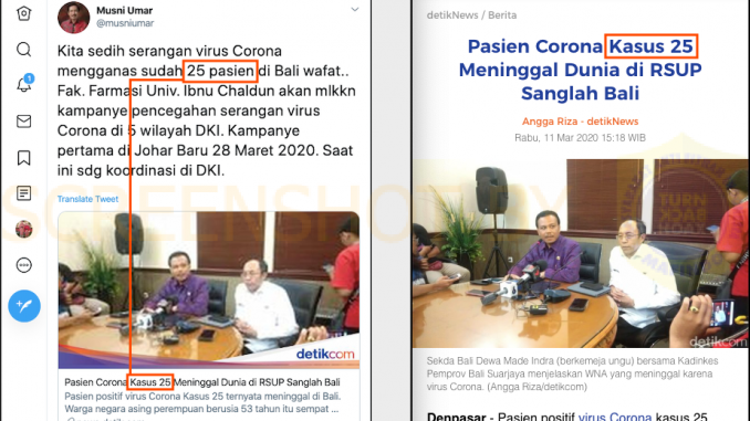 SUMBER membagikan artikel dengan judul “Pasien Corona Kasus 25 Meninggal Dunia di RSUP Sanglah Bali” menjadi “sudah 25 pasien di Bali wafat”. Penyebutan pasien URUTAN ke 25 menjadi pasien SEBANYAK 25 menimbulkan kesimpulan yang salah.