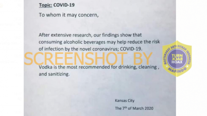 Beredar informasi yang menyebut konsumsi minuman alkohol bisa kurangi risiko terinfeksi virus corona COVID-19. Pemberitahuan ini juga terdapat logo Saint Luke’s Health System, sebuah Rumah Sakit di Kota Kansas, Missouri, Amerika Serikat.