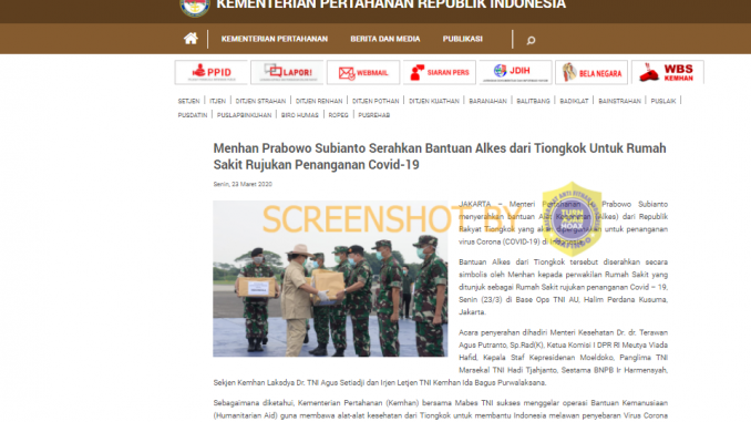 Diketahui dari situs kemhan.go.id dengan artikel berjudul “Menhan Prabowo Subianto Serahkan Bantuan Alkes dari Tiongkok Untuk Rumah Sakit Rujukan Penanganan Covid-19,” dijelaskan bahwa “Kementerian Pertahanan (Kemhan) bersama Mabes TNI sukses menggelar operasi Bantuan Kemanusiaan (Humanitarian Aid) guna membawa alat-alat kesehatan dari Tiongkok untuk membantu Indonesia melawan penyebaran Virus Corona (COVID-19) di Tanah Air. Operasi Humanitarian aid yang digagas oleh Prabowo Subianto ini dilakukan oleh Kemhan dan Mabes TNI atas bantuan Kementrian Pertahanan (Kemhan) Republik Rakyat Tiongkok (RRT) serta dukungan Corporate Social Responsibility (CSR) sejumlah perusahaan Tiongkok yang berinvestasi di Indonesia”.