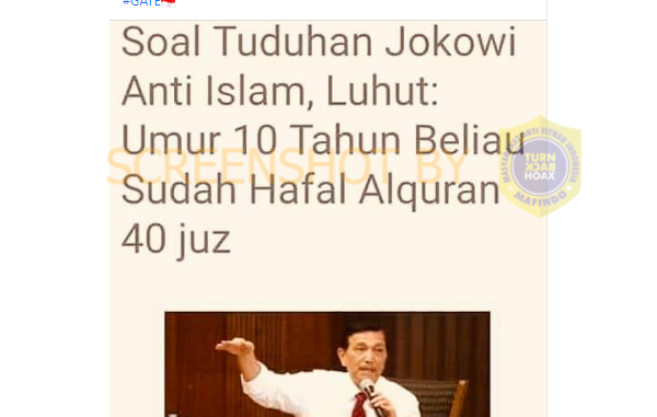 Akun facebook bernama Angga Evron mengunggah gambar berupa tangkapan layar artikel dengan menampilkan foto Menteri Koordinator Bidang Kemaritiman dan Investasi Indonesia, Luhut Binsar Panjaitan dengan judul “Soal Tuduhan Jokowi Anti Islam, Luhut: Umur 10 Tahun Beliau Sudah Hafal Alquran 40 Juz”.