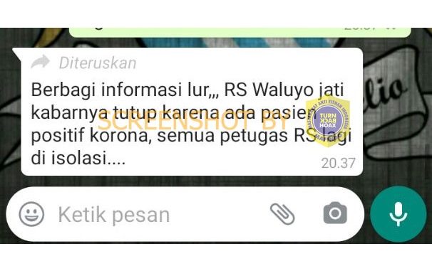 “Berbagi informasi lur,,, RS Waluyo jati kabarnya tutup karena ada pasien positif korona, semua petugas RS lagi di isolasi….”
