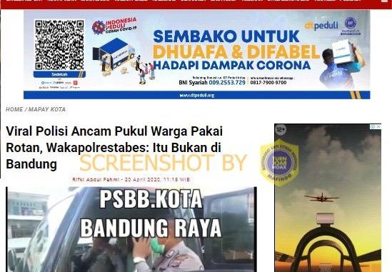 Beredar unggahan video yang telah di tambahkan narasi oleh akun Dedi Supriadi melalui Facebook bahwa pihak Kepolisian sedang mensosialisasikan PSBB Kota Bandung Raya diterapkan mulai hari Senin pukul 14.00, bagi warga yang masih melanggar akan diancam dipukul dengan rotan oleh aparat.