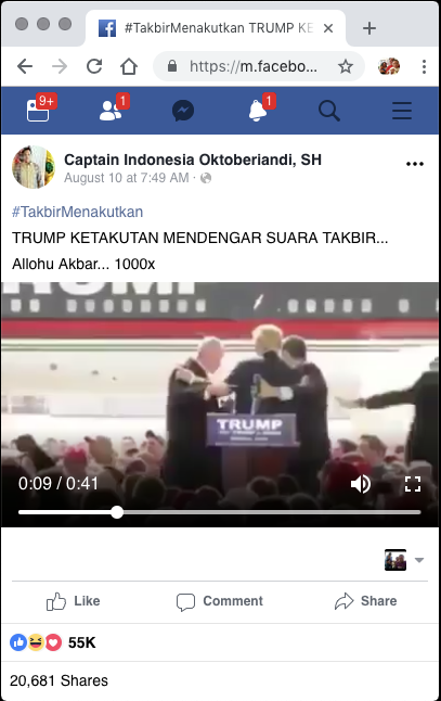 Tidak ada suara takbir, video yang digunakan oleh post sumber adalah hasil suntingan. Kejadian yang sebenarnya: reaksi Trump terhadap pemrotes yang berusaha naik ke panggung, selengkapnya di bagian PENJELASAN dan REFERENSI.