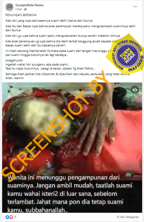 Akun Facebook Yusniprofilda Parera mengunggah foto yang diklaim sebagai foto istri durhaka kepada suaminya.