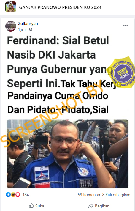 Akun Facebook Zulfiansyah mengunggah tangkapan layar judul “Ferdinand: Sial Betul Nasib DKI Jakarta Punya Gubernur yang Seperti Ini. Tak Tahu Kerja Pandainya Cuma Omdo Dan Pidato-Pidato, Sial.”