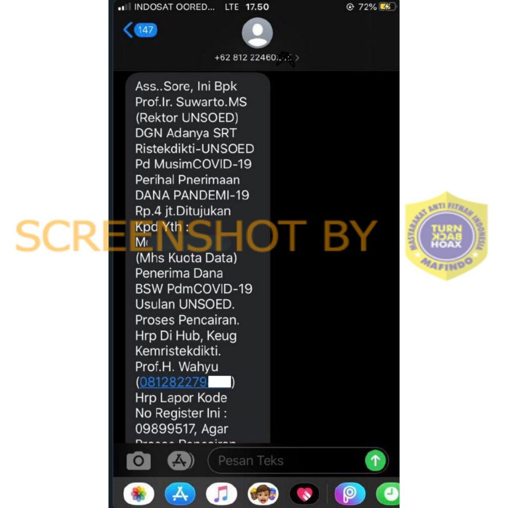 Telah beredar pesan singkat mengatasnamakan Rektor Universitas Soedirman, Prof. Dr. Ir. Suwarto, mengenai pencairan dana bagi mahasiswa di masa pandemi COVID-19.