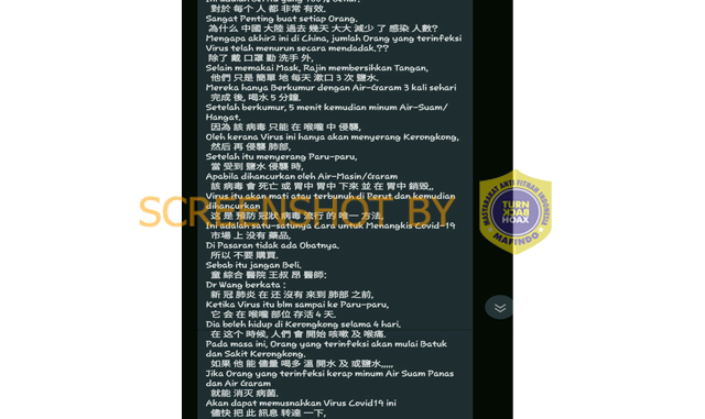 Dengan demikian, informasi bahwa salah satu cara untuk menangkis virus covid-19 yaitu dengan berkumur air garam 3 kali sehari kemudian minum air hangat adalah konten yang menyesatkan, karena tidak ada bukti bahwa hal itu dapat membantu menangkal atau mengusir infeksi dari COVID- 19 penyakit virus korona dan belum ada studi yang menyatakan kandungan dari air garam dapat membunuh virus corona.