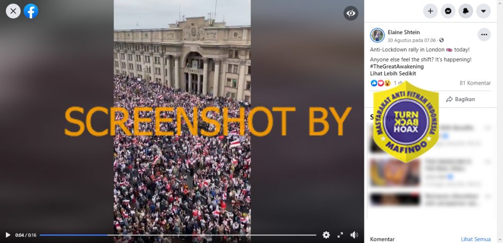 Video tersebut bukan demonstrasi anti lockdown di London. Video tersebut merupakan peristiwa aksi demo itu berlangsung di Belarus, menyuarakan tentang demokrasi.