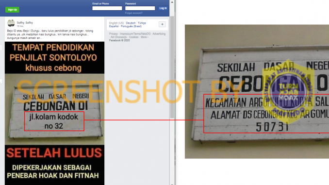 Akun Facebook bernama Sofhy Sofhy mengunggah status pada tanggal 06/9/2020 di grup facebook ‘Indonesia 24 Jam’ berupa foto papan nama sekolah bertuliskan ‘SEKOLAH DASAR NEGERI CEBONGAN 01 JL. KOLAM KODOK NO.32’.