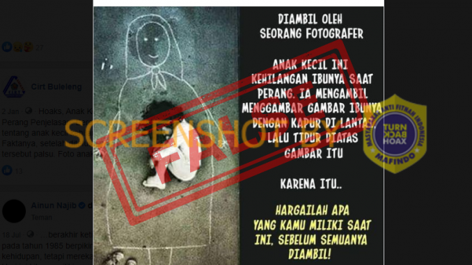 Berdasarkan hasil penelusuran, klaim adanya foto seorang anak perempuan sedang tertidur di tanah di tengah-tengah lukisan kapur yang kehilangan ibunya saat perang adalah klaim yang salah.