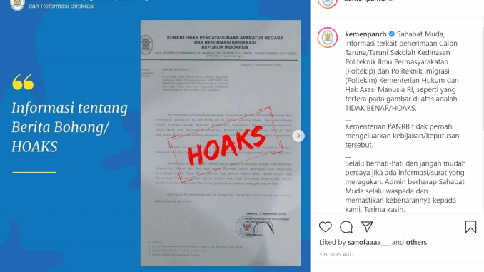 Informasi palsu. Melalui Instagram resminya, ditegaskan bahwa Kementerian PANRB tidak pernah mengeluarkan kebijakan atau keputusan seperti halnya keterangan pada surat yang beredar.