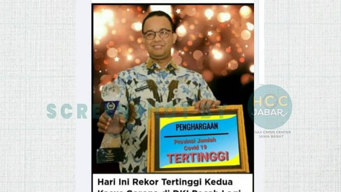 Foto Gubernur Anies tersebut terpasang bersamaan dengan tangkapan layar berita dari cnbcindonesia.com dengan judul “Hari Ini Rekor Tertinggi Kedua Kasus Corona di DKI Pecah Lagi” yang ditayangkan, Senin (6/9) dengan penulisnya Ferry Sandi.