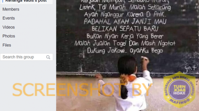 Akun Facebook Kenanga Vadis Pinso mengunggah foto pada grup Facebook MANUSIA MERDEKA. Di dalam foto yang diunggah pada 8 September itu, terdapat seorang siswi yang sedang menulis kalimat berbahasa Indonesia di papan tulis menggunakan kapur.