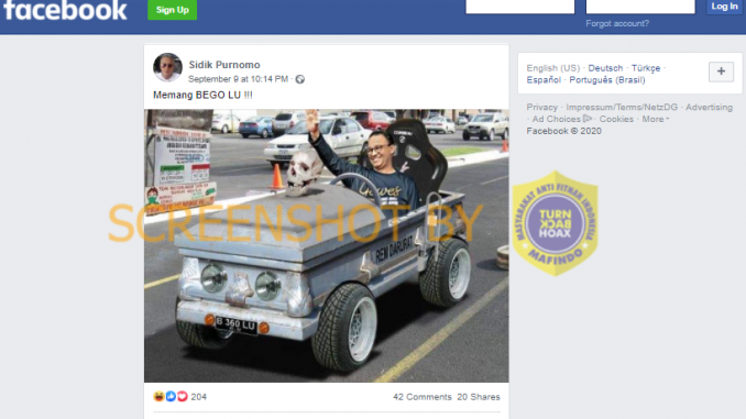Akun Facebook bernama Sidik Purnomo mengunggah status pada tanggal 10/9/2020 berupa gambar Anies Baswedan mengendarai mobil berbentuk peti mati dengan narasi berbunyi ‘Memang BEGO LU !!!’.