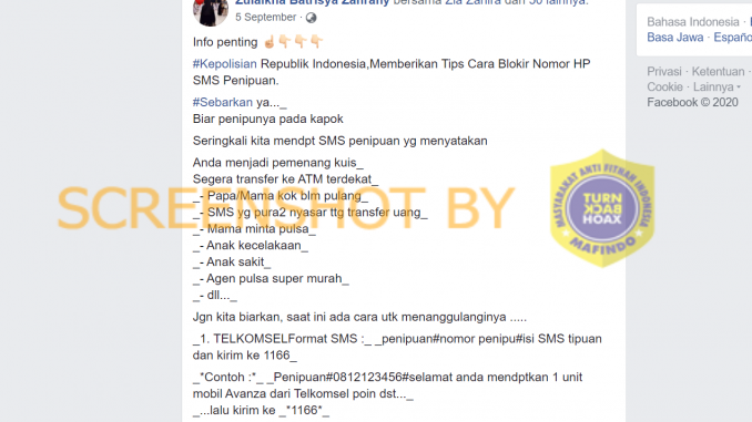 Beredar melalui media sosial Facebook informasi seputar adanya tips memblokir nomor dari SMS penipuan yang diberikan oleh Kepolisian Republik Indonesia (Polri). Unggahan tersebut dibagikan oleh akun @ZulaikhaBatrisyaZahrany pada 5 September 2020, dan dibagikan ulang oleh 12 pengguna Facebook lainnya.