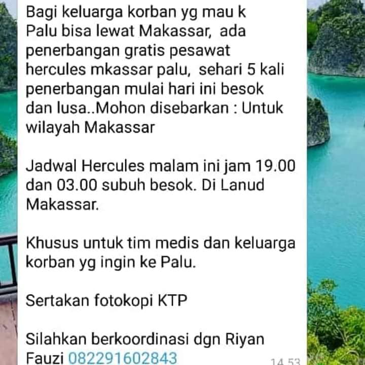 Informasi tentang adanya pesawat Hercules gratis untuk penerbangan ke Palu bagi keluarga korban gempa dan tsunami merupakan informasi yang tidak benar. Informasi yang tersebar melalui media pesan Whatsapp dan media sosial itu dibantah oleh pihak TNI Angkatan Udara. Melalui akun Twitter resminya, yakni @_TNIAU, TNI AU menyatakan bahwa pesawat Hercules TNI AU yang menuju Palu diutamakan membawa bantuan logistik, paramedis, obat-obatan, makanan siap saji, alat berat hingga mengangkut pengungsi korban gempa atau tsunami yang diutamakan lansia, wanita, dan anak-anak.