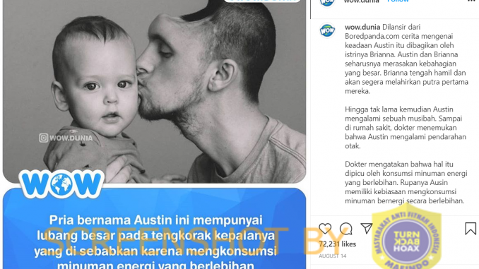 Akun Instagram WOW DUNIA (@wow.dunia) mengunggah foto dengan disertai narasi yang menginformasikan bahwa di tengkorak kepala seorang pria bernama Austin terdapat lubang besar akibat mengkonsumsi minuman energi secara berlebihan pada 14 Agustus 2020. Unggahan tersebut telah disukai sebanyak 72,232 kali.