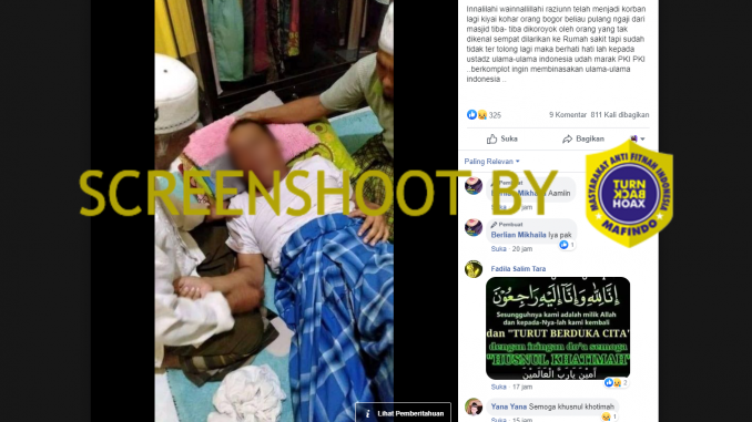 “Innalilahi wainnallillahi raziunn telah menjadi korban lagi kiyai kohar orang bogor beliau pulang ngaji dari masjid tiba- tiba dikoroyok oleh orang yang tak dikenal sempat dilarikan ke Rumah sakit tapi sudah tidak ter tolong lagi maka berhati hati lah kepada ustadz ulama-ulama indonesia udah marak PKI PKI ..berkomplot ingin membinasakan ulama-ulama indonesia ..”