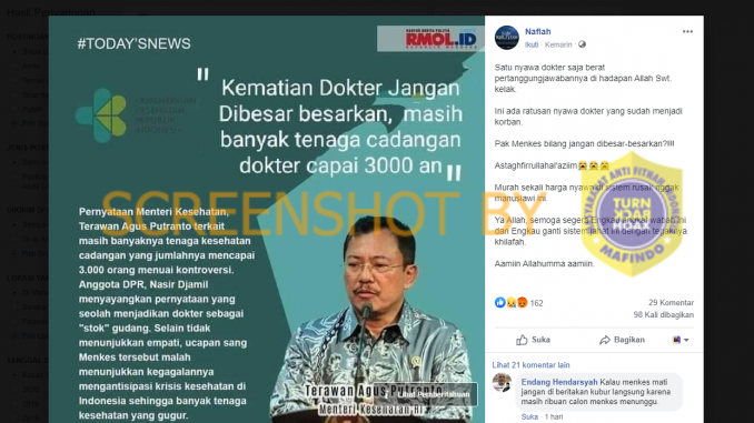 Gambar tersebut berisi foto Menteri Kesehatan Terawan Agus Putranto dengan kutipan “Kematian Dokter Jangan Dibesar-besarkan, masih banyak tenaga cadangan dokter capai 3 ribuan” dan “Selain tidak menunjukkan empati, ucapan sang menkes tersebut malah menunjukkan kegagalannya mengantisipasi krisis kesehatan di Indonesia sehingga banyak tenaga kesehatan yang gugur,”