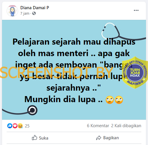 Beredar isu di media sosial yang menyatakan bahwa mata pelajaran sejarah akan dihapus oleh Menteri Pendidikan dan Kebudayaan. Salah satu akun yang membagikan perihal isu tersebut ialah Akun Facebook Diana Damai P.