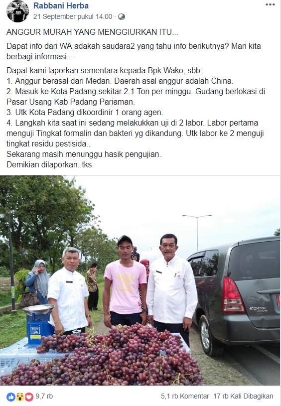 Informasi yang menyebutkan anggur yang dijual pinggir jalan sekitar daerah Padang dan Tegal mengandung formalin adalah informasi yang tidak benar. Sebab, dilansir dari topsatu.com, Kepala Dinas Pangan Sumatra Barat, Efendi menyatakan, berdasarkan hasil laboratorium, anggur yang dijual pinggir jalan di daerah Padang, tepatnya di sepanjang Jalan Raya Buayan, Padang Pariaman dan Padang By Pass, tidak mengandung formalin dan bebas pestisida. Sedangkan, untuk isu di Tegal, dilansir dari panturapost.com, Kepala Dinas Kesehatan (Dinkes) Kabupaten Tegal, Hendadi Sutaji, mengatakan dengan tegas bahwa berita itu adalah hoaks. “Intinya gambar yang viral di Facebook dan Whatsapp itu bukan di Kabupaten Tegal. Itu hoaks. Tegal bebas formalin. Foto itu asli ada di Kabupaten Padang Pariaman, Provinsi Sumbar,” ujarnya.