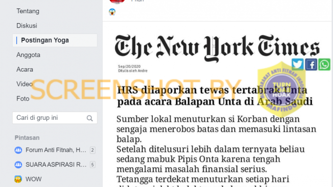 Melalui media sosial Facebook, akun @YogaHowedes membagikan foto berupa tangkapan layar artikel “The New York Times” berjudul “HRS dilaporkan tewas tertabrak Unta pada acara Balapan Unta di Arab Saudi” dengan tanggal penerbitan menunjukan 20 September 2020. Namun pasca dilakukan penelusuran lebih lanjut, diketahui bahwa unggahan milik @YogaHowedes adalah palsu alias hoaks.