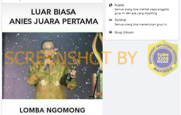 Akun facebook bernama Mas Gun mengunggah status pada tanggal 20/9/2020 di grup facebook ‘ANIES BASWEDAN PRESIDEN RI 2024’ berupa gambar Gubernur DKI Jakarta Anies Baswedan memegang piala dengan narasi Anies juara pertama lomba ngomong tingkat internasional.